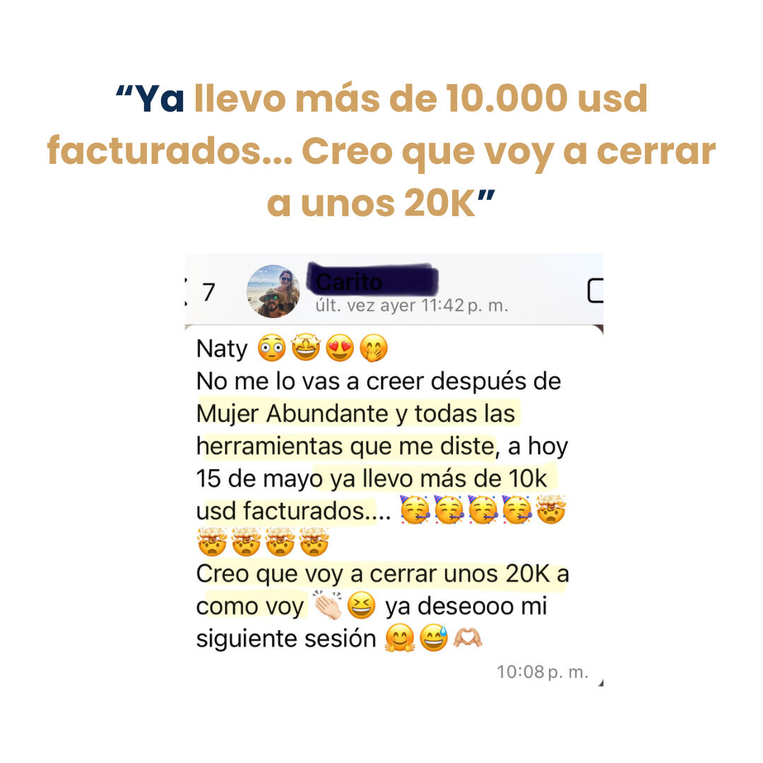 Si estas acá es porque sabes que ya no se trata de aprender más estrategias ni de trabajar el doble o que sea con esfuerzo, es hora de eliminar las resistencias y bloqueos que tienes con el dinero y no estas viendo, para escalar tus ingresos. Olvídate de hacer más y más para lograrlo, ese no es el camino.Tengo clientas que inlcuso ya están facturando +20K por mes pero saben que no se trata de seguir corriendo detrás de la estrategia porque ya la saben y vienen a mi para desbloquear resistencias que no le permiten ir por los 50/100K al mes. Y dicho por ellas mismas, logran encontrar cuál era la clave que no estaban viendo para escalar sus ingresos.Pase de facturar en un año lo que ahora facturo en un mes, sin lanzamientos, sin llamadas de venta y sin masterclass. Facturar +10K/15K es posible porque sé anclar la Identidad de Riqueza e implementar acciones alineadas al área estratégica que mi negocio requiere para escalar consistentemente mis ingresos.
