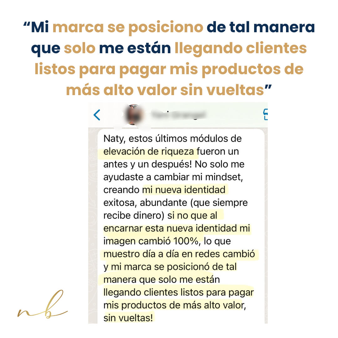 🔥 Como funciona la estrategia de Neurociencia para eliminar resistencias inconscientes con el dinero y que así puedas escalar tus ingresos al ser más consistentes y sostenibles.. (Esas resistencias son la razón por la cual tus ingresos suben y bajan, un mes ganas mucho y al otro no).🔥 Como vas a normalizar altas cifras en tu mente para que recibir más dinero sea tu nuevo estándar. (Cuando tu mente ve como familiar o normal esa cifra es cuando las resistencias pasan a un lado y empiezas a recibir cada vez más dinero).🔥 Como Anclar y sostener tu Identidad de Riqueza 24/7 (Esto te permitirá que cuando tu ego, miedos, inseguridades quieran desalinearte sepas que hacer en ese momento para mantenerte en la determinación y poder personal sin que eso te saque del camino).🔥 Como y que hacer para incrementar estratégicamente la cantidad de dinero que generas. (Harás un análisis estratégico en tu negocio para aumentar el flujo del dinero constantemente, ver en donde lo estas limitando y saber como aumentar las transacciones de tus clientes para crear compradores repetitivos).🔥 Como subir tus precios y dejar atrás a clientes que ya no están alineados a esa cifra o a tu nueva identidad. (Esto te permitirá comenzar a atraer a esa clienta comprometida, que acciona con cada cosa que le decís y paga sin vueltas).🔥 Como ser percibida por tu audiencia como referente en tu nicho. (Actualmente esto es clave para lograr una alta conversión en tus ventas, atraer a clientes de alto valor y lograr una marca que se posiciona en la mente de tu cliente, llevándote a ser pagada por precios más altos sin objeciones).